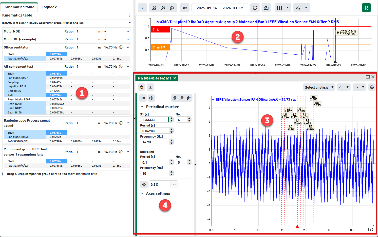 Register Kinematiktabelle für die Anzeige der Bauteile und ihrer Schadfrequenzen Register Logbuch für die Anzeige der zugehörigen Logbucheinträge |