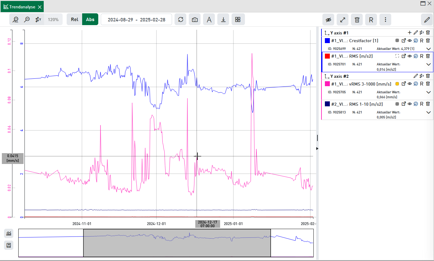 Der Analysemodus wird beim Laden eines Trends automatisch aktiviert. Den aktiven Analysemodus erkennt man daran, dass der Cursor automatisch beim Trend einschnappt. Wird ein Datenpunkt eines Trends mit einem rechten Mausklick selektiert, öffnet sich zu diesem Zeitstempel ein Dialog zum Öffnen der Signalanalyse. Der Analysemodus kann für alle Trends oder in der Legende explizit für einen Trend aktiviert werden. Wird ein Trend selektiert, wird verhindert, dass ein falscher Trend bzw. Sensor für die nachfolgende Signalanalyse selektiert wird. In diesem Modus wird immer der zur Mausposition nächstgelegene Datenpunkt des selektierten Trends für die nachfolgende Signalanalyse gewählt.