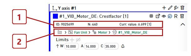 Optionally, if you open the three-dot menu in the toolbar of the trend view, you can show or hide metadata of the signal (1) and the plant path (2) of the corresponding component.