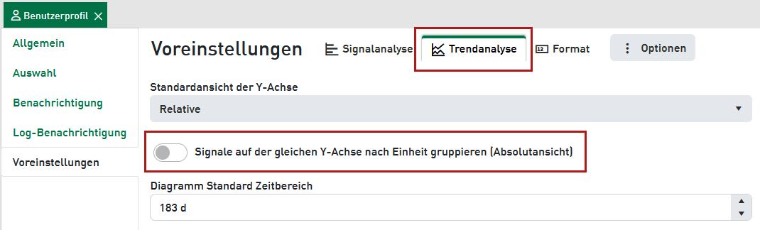 Diese Einstellung kann auch im Benutzerprofil unter Voreinstellungen – Trendanalyse als Standardeinstellung gesetzt werden:
