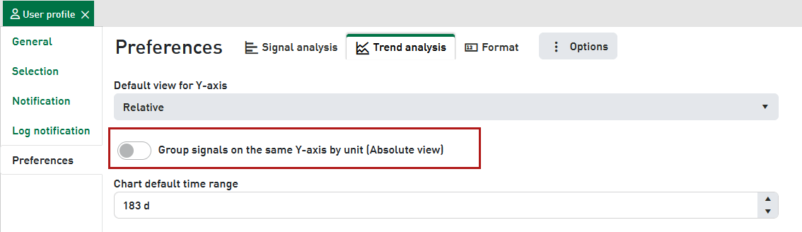 This setting is also available in the user profile, under Preferences - Trend analysis, to be set as a default setting: