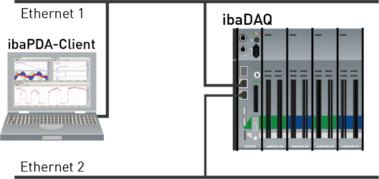 ibaDAQ kann in zwei verschiedenen Netzwerken betrieben werden, um beispielsweise das Netzwerk, in dem Messdaten übertragen und erfasst werden, vom restlichen Netzwerk zu trennen. Hierfür stehen 2 Ethernet-Schnittstellen zur Verfügung. Einstellungen für die Adressierung in den Netzwerken, siehe Drehschalter S1.