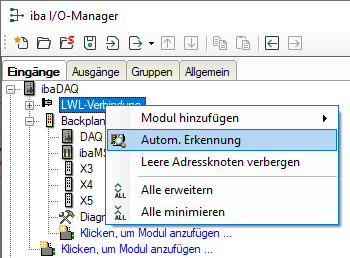 Um das Gerät in ibaPDA zu integrieren, klicken Sie mit der rechten Maustaste auf den Link "LWL-Verbindung" und wählen Autom. Erkennung. Das Gerät und das verwendete ibaNet-Protokoll werden automatisch erkannt und im Modulbaum angezeigt.