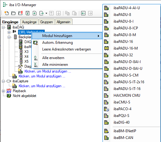 Alternativ kann das Gerät auch manuell hinzugefügt werden, indem Sie über das Kontextmenü Modul hinzufügen auswählen und dann das entsprechende Gerät.
