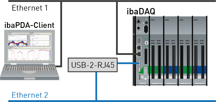 Using a USB-WLAN or USB-RJ45 adapter at the USB port is another possibility to operate ibaDAQ in two different networks. There is no need for a special adapter type. Any commercial adapter that supports Windows 10 or higher can be used for this purpose. However, the corresponding drivers need to be installed on the device.