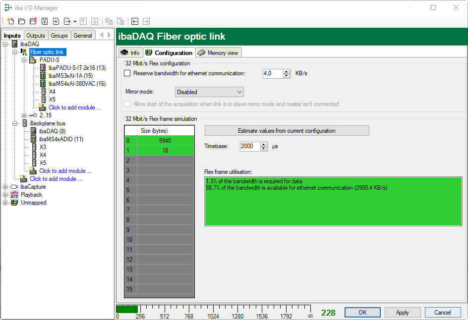 Beginning with version 6.33.1, ibaPDA provides a simulator which calculates the data size that can be transmitted via fiber optics with 32Mbit Flex protocol. The simulator is available in the Configuration tab.