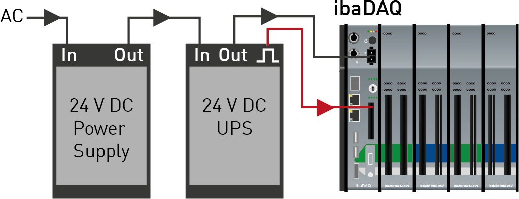 Zur Sicherstellung eines optimalen Betriebs wird empfohlen, die Stromversorgung des ibaDAQ-Systems über eine USV (Unterbrechungsfreie Stromversorgung) mit zusätzlichem Digitalausgang zu puffern. Der Digitalausgang der USV dient hierbei als Signal zum sicheren Herunterfahren des ibaDAQ-Betriebssystems.