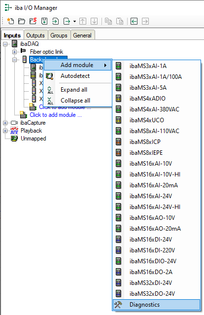 The "Diagnostics” module provides diagnostic signals. The module has to be added manually by right-clicking the "Backplane bus” module and selecting "Diagnostics” from the context menu.