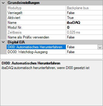 Über den Eingang DI 00 kann ein sicheres Herunterfahren und Ausschalten initiiert werden, wenn ein Triggersignal eine Unterbrechung der Spannungsversorgung meldet. Die Konfiguration erfolgt in ibaPDA.