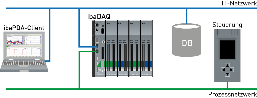 Mit den beiden unabhängigen 1Gbit/s-Ethernet-Schnittstellen kann ibaDAQ in zwei Netzen agieren und ermöglicht dadurch eine Trennung von IT- und Prozessnetzwerk. Durch diese Trennung können beispielsweise Datenbanken und Storage-Systeme an ibaDAQ angebunden werden, die sich im IT-Netzwerk befinden.