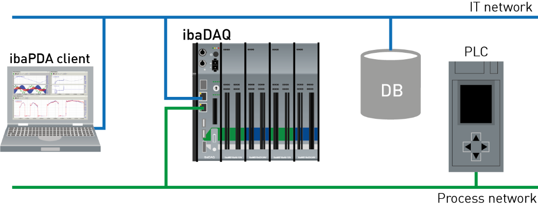 With the two independent 1Gbit/s Ethernet interfaces, ibaDAQ can operate in two networks and thus enable the separation of IT and process networks. This separation allows, for example, databases and storage systems to be connected to ibaDAQ, which are located in the IT network.