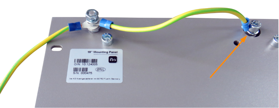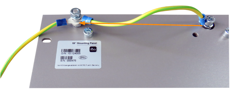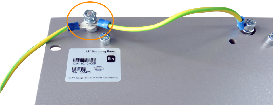 After the backplane panel is mounted on the 19" mounting panel, the backplane panel must be grounded via the mounting panel. Screw the grounding cable on the back of the mounting panel to the backplane panel. Use the screw connection, see Grounding – ibaPADU-S-B4S.