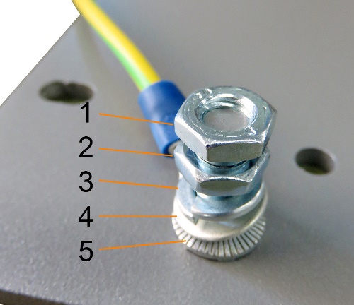 Connect the cable to the next threaded bolt of the mounting panel. The grounding of the mounting panel is also connected to the threaded bolt.
