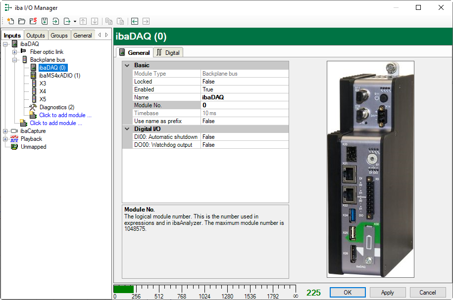 In the General tab, make the basic settings and settings for automatic shutdown and the watchdog function for the "ibaDAQ" module.