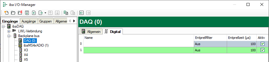 Über eine Auswahlliste können Sie die Betriebsart des Entprellfilters auswählen. Mögliche Einstellungen: aus, Halten der steigenden Flanke, Halten der fallenden Flanke, beide Flanken halten, beide Flanken verzögern.