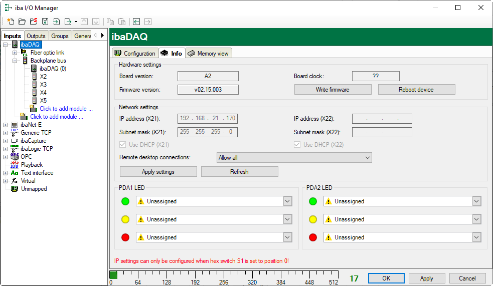 In the Info tab, make the hardware settings and network settings for the "ibaDAQ" module. Here you can assign signals to the LEDs PDA1 and PDA2.