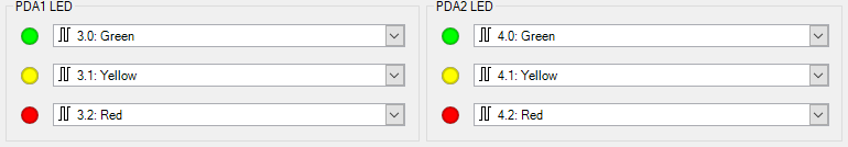 Here you can assign signals to the LEDs PDA1 and PDA2. 3 colors (green, yellow, and red) are available for each LED. Select one input signal respectively from the drop-down menu. If the corresponding signal applies, the LED will light up in the configured color.
