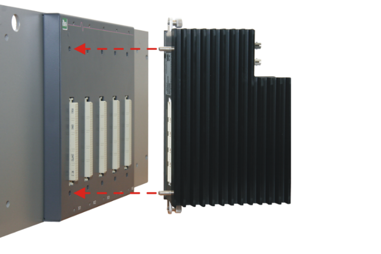 Achten Sie darauf, dass die Führungsbolzen an der Rückseite des Geräts in die dafür vorgesehenen Bohrungen auf dem Baugruppenträger gleiten.