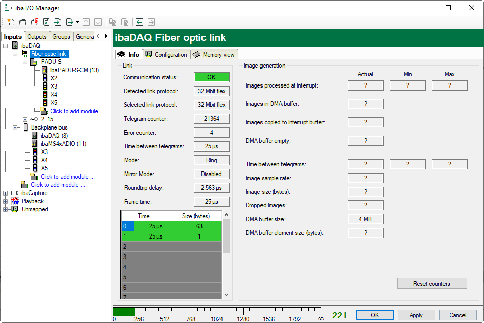 The screenshot shows the information you see when the link is in 32Mbit Flex mode. Up to 15 devices can be connected in a ring topology per FO link. In the signal tree on the left, the links 1 - 15 below the FO link correspond to the address set at the connected device by means of the rotary switch.