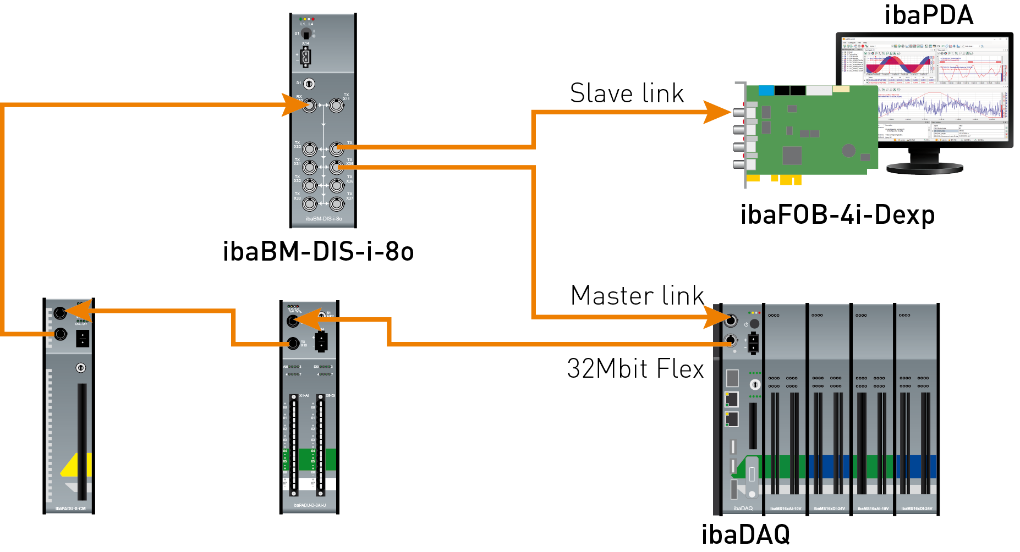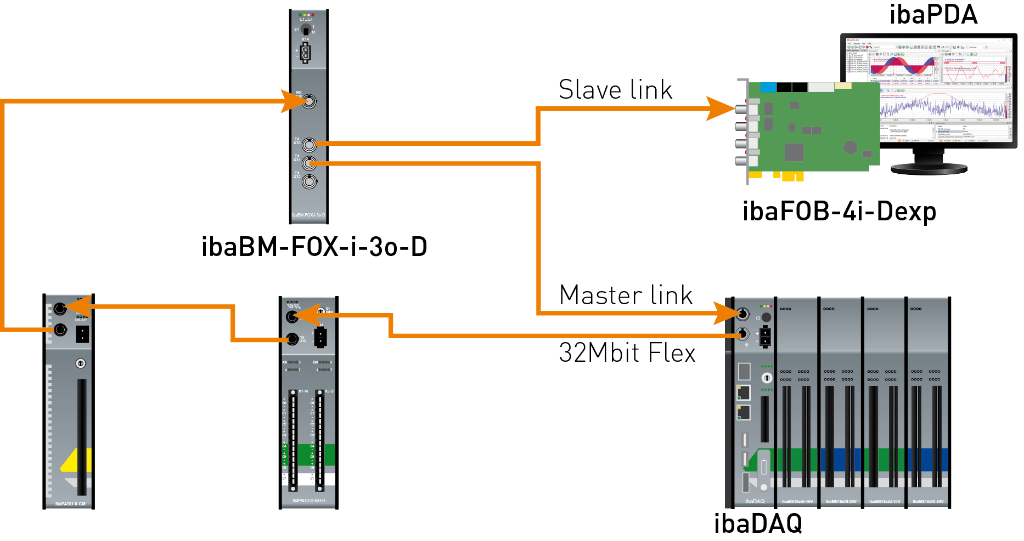 The fiber optic output of the last Flex device is connected to the input of an ibaBM-FOX-i-3o-D device. One FO output of ibaBM-FOX-3o-D is connected to the FO input of the ibaPDA master (ibaDAQ in the example) and of the ibaPDA slave.