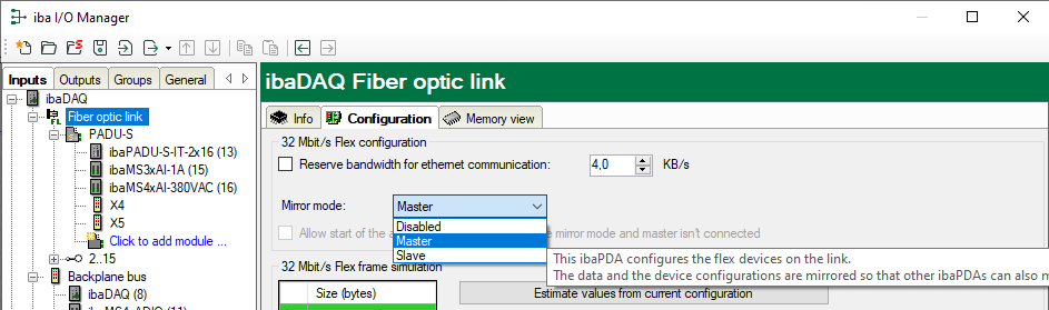 Master: This ibaPDA system configures the Flex devices on the link. The data and the device configurations are mirrored so that other ibaPDA systems can also acquire the data.