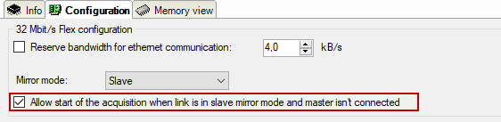 If the slave doesn’t receive a configuration within 6 s, ibaPDA generates an error message. If the option Allow start of the acquisition when the link is in slave mirror mode and master isn’t connected is enabled, then the acquisition will start anyway with the last configuration.