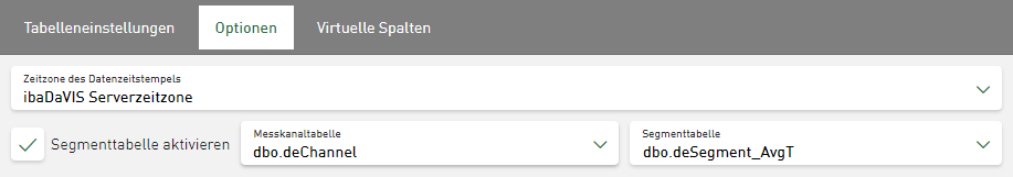 Wenn Sie mit der DB-Funktionalität von ibaAnalyzer arbeiten, ist es möglich, die Daten im Multi-Column-Format (MC-Format) abzulegen. Dieses Format arbeitet auf Basis mehrerer Tabellen, die alle den Segmenttabellennamen tragen und sich im Suffix unterscheiden. Wählen Sie als Segmenttabelle die Tabelle mit dem Suffix "_AvgT" aus, wenn Sie mit dem MC-Format arbeiten.