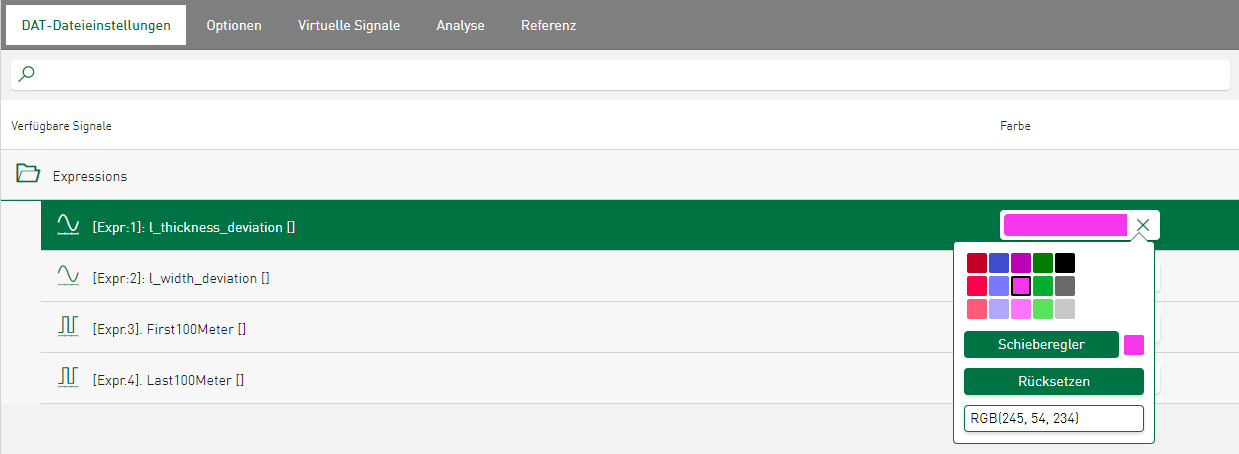 Über das Farbfeld können Sie die Standardfarbe für die aufgelisteten Dateisignale bestimmen, siehe Farbauswahl in Datenquellen. In jeder Kachel, die Signale aus DAT-Dateien dieser Datenquelle anzeigt, werden diese Farbeinstellungen verwendet, um die Signaltrends zu visualisieren. Die Signalfarbe können Sie jederzeit in der jeweiligen Kachelansicht ändern, siehe Farbauswahl in Kacheln.