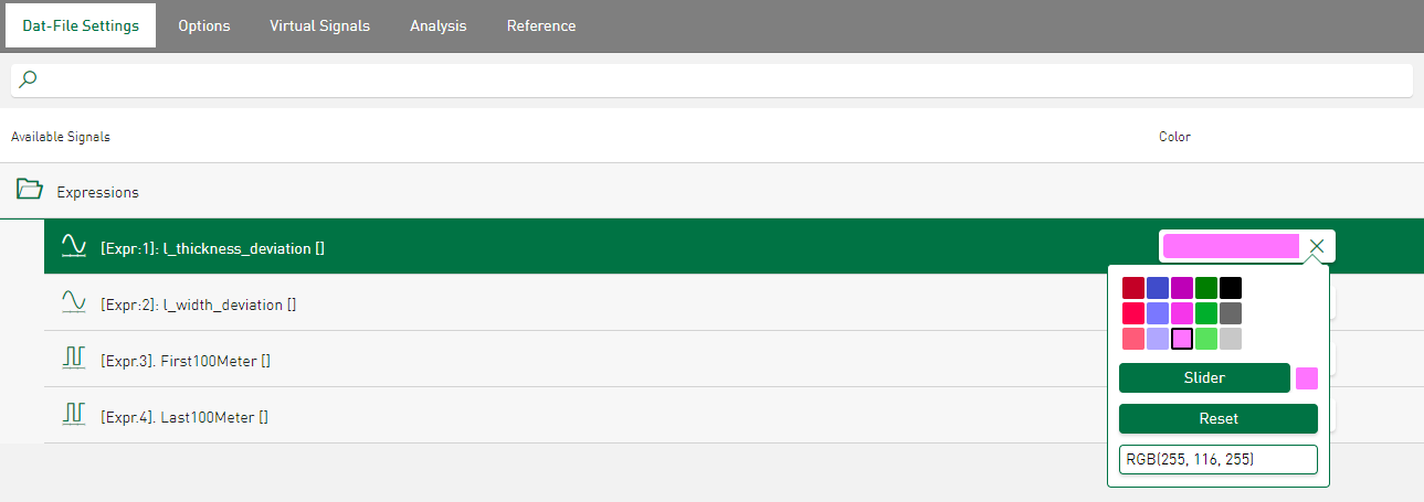You can use the color field to specify the default color for the listed file signals, see Color selection in datasources. In each tile that displays signals from DAT files of this datasource, these color settings are used to visualize the signal trends. You can change the signal color at any time in the corresponding tile view, see Color selection in tiles.