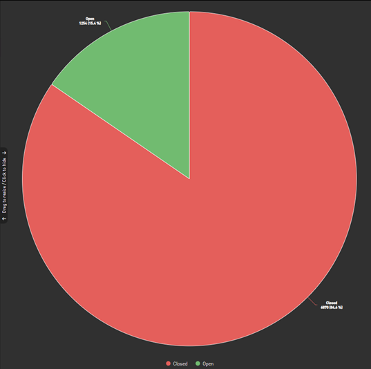 Das Kreisdiagramm zeigt das Verhältnis von "Closed" (hier rot) zu "Open" (grün) an.