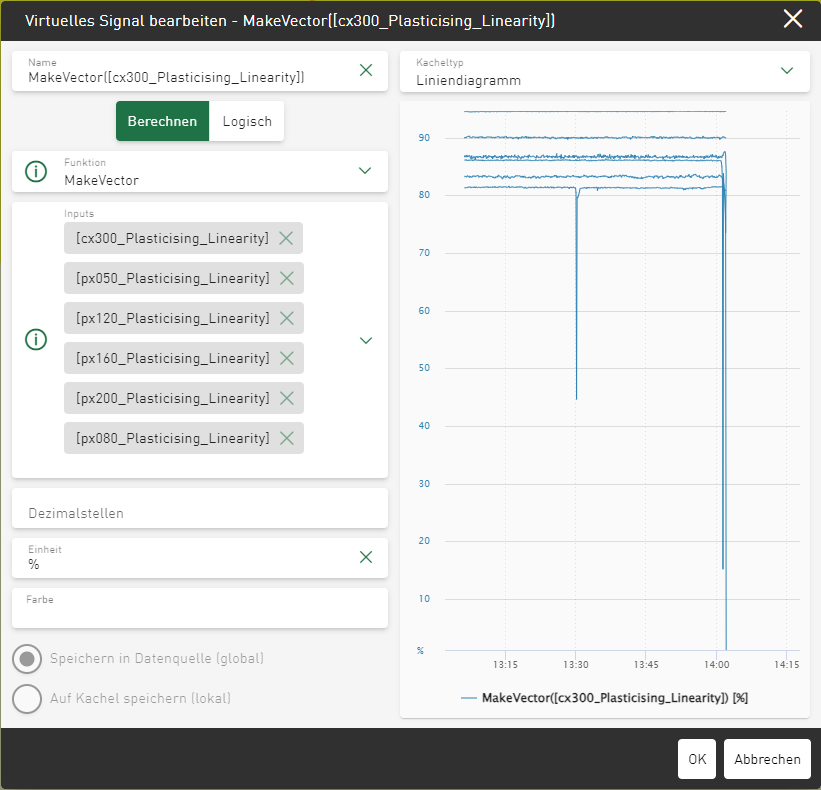 Erstellen Sie ein virtuelles Signal und wählen Sie unter Berechnen die Funktion MakeVector(). Wählen Sie im Feld Inputs mindestens zwei Signale, die Sie zusammenfassen wollen.