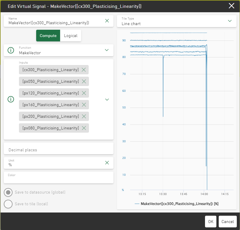 The MakeVector() function allows you to combine signals from DAT files or columns of a database table into logical signal groups and display them in a heatmap. Proceed as follows: