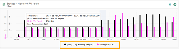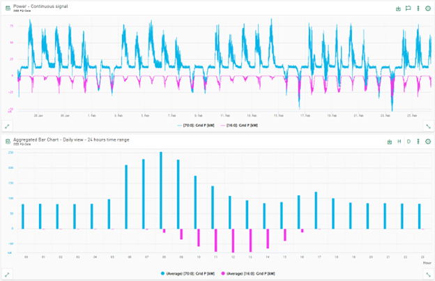 Die im Balkendiagramm angezeigten Daten können Sie nun in verschiedenen Zeitintervallen aggregieren. Die Daten innerhalb des Zeitbereichs können zudem anhand von Unterzeitbereichen aggregiert und visualisiert werden, z. B. die Stunden innerhalb eines Tages oder die Tage innerhalb einer Woche.