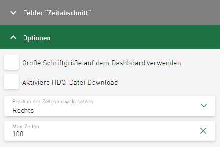 Sie können nun HD-Zeitabschnittsablagen als Datenquelle für Tabellenkacheln auf Dashboards auswählen. Basierend auf den angezeigten Daten der Tabelle ist der Export als CSV-Datei möglich. Darüber hinaus können Sie den HDQ-Download für die angezeigten HD-Zeitabschnittsdaten aus der Tabelle aktivieren. Die Option zum Aktivieren des Downloads von Zeitabschnitten finden Sie in den Tabellenoptionen der Kachel.