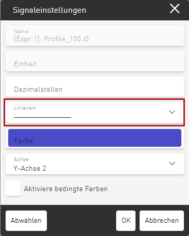Standardmäßig werden Signale mit einer durchgezogenen Linie dargestellt. Über das Auswahlfeld können Sie den Linienstil z. B. in eine gestrichelte oder gepunktete Linie ändern.