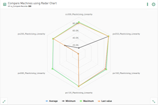 Mit dem Kacheltyp Radardiagramm können Sie Daten aus Datenbanktabellen, ibaHD-Server oder DAT-Dateien darstellen. Verwenden Sie das Radardiagramm z. B., um statistische Daten wie Maximal-, Minimal- und Durchschnittswerte von mehreren ausgewählten Spalten oder Signalen anzuzeigen.