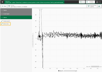 Das XY-Diagramm ermöglicht die Visualisierung von numerischen Daten. Die Daten können aus DAT-Dateien, HD-Tabellen oder ereignis- und zeitbasierten HD-Ablagen stammen. Die ausgewählten Signal- oder Säulendaten werden standardmäßig in chronologischer Reihenfolge als XY-Diagramm mit der Zeit als X-Achse angezeigt. Jedes Signal oder jede Spalte kann als X-Achse zugewiesen werden. Das XY-Diagramm wird entsprechend den neuen Einstellungen geändert und das relationale XY-Diagramm wird angezeigt.