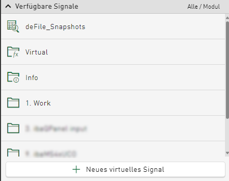 Die konfigurierten virtuellen Signale finden Sie ebenfalls in einem separaten Ordner im gleichen Signalbaum. Die DAT-Datei-spezifischen Infofelder werden wie in anderen iba-Tools zum Signalbaum hinzugefügt und als erweiterbarer Ordner angezeigt. Im gleichen Signalbaum werden die Datendatei-Signale nach Modulen oder logischen Gruppen geordnet darunter eingefügt.