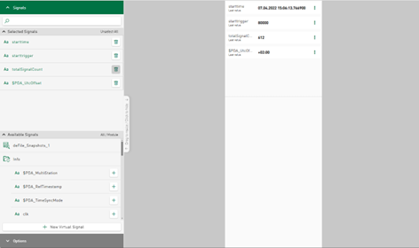 DAT-Dateien enthalten neben den Signaldaten auch eine Reihe von Infofeldern. Je nach Anwendung sind die Anzahl der Infofelder und die Werte unterschiedlich. Dennoch kann die Kachel für die Werteanzeige nun neben den Signaldaten auch die Infofelddaten aus den Datendateien anzeigen. Der Signalbaum stellt neben den Signaldaten auch die Infofelder als Textkanäle zur Verfügung. Die Infofelder können Sie ähnlich wie die Signaldaten auswählen, um sie in der Werteanzeige zu visualisieren.