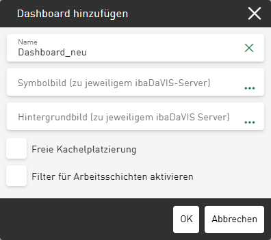 Wählen Sie optional im Feld Hintergrundbild (zu jeweiligem ibaDaVIS-Server) ein Bild, das als Hintergrund auf dem Dashboard erscheinen soll.