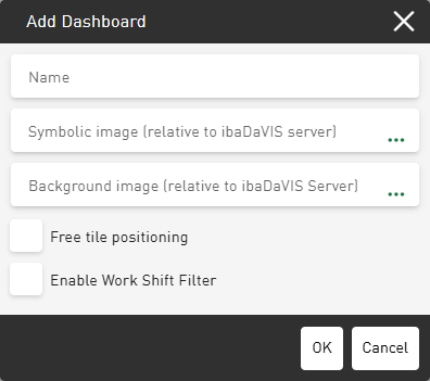Optionally, select an image in the field Background image (relative to ibaDaVIS server) that you want to appear as the background on the dashboard.