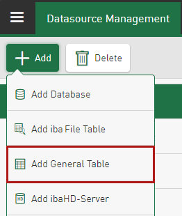 For the General Table datasource type, all available tables and database views that contain a date/time column can be selected from a list.