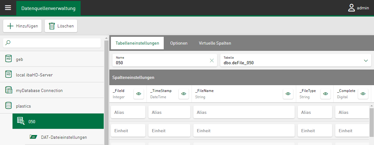 iba-Dateitabellen beinhalten Werte, die mit der DB-Funktionalität von ibaAnalyzer in die Dateitabelle der Datenbank eingetragen wurden. So haben Sie Zugriff auf die Signale der zugrundeliegenden DAT-Dateien.