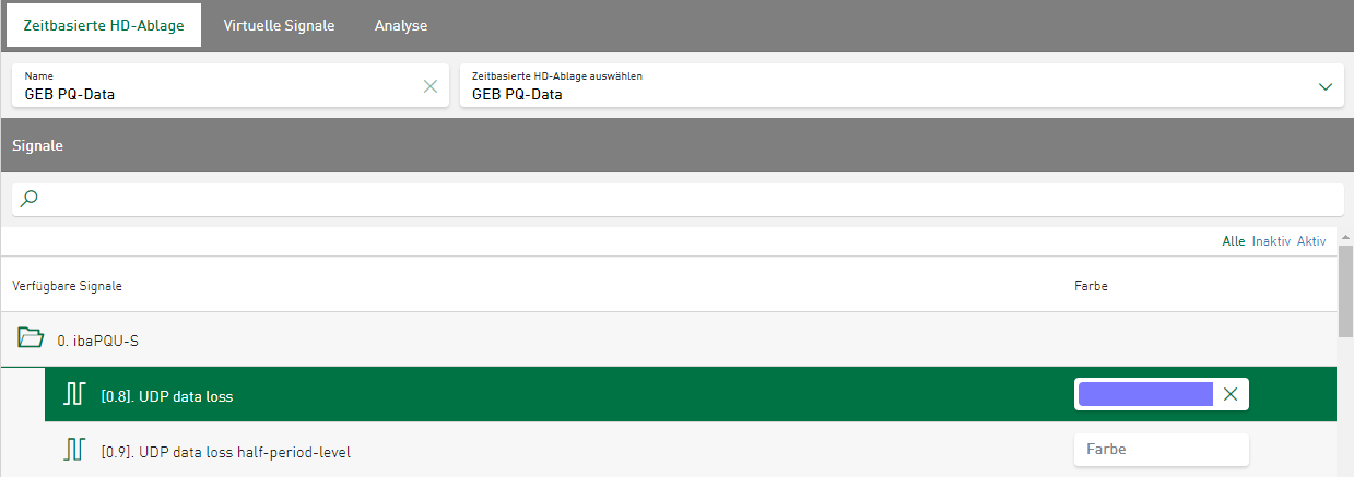 Unter Signale wird der Signalbaum der gewählten HD-Ablage angezeigt. Über das Farbfeld können Sie dem jeweiligen Signal eine bestimmte Farbe zuordnen.