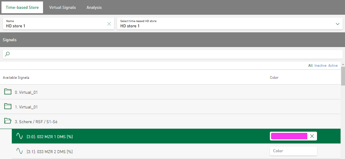 Signals displays the signal tree of the selected HD store. Use the color field to assign a certain color to the respective signal.