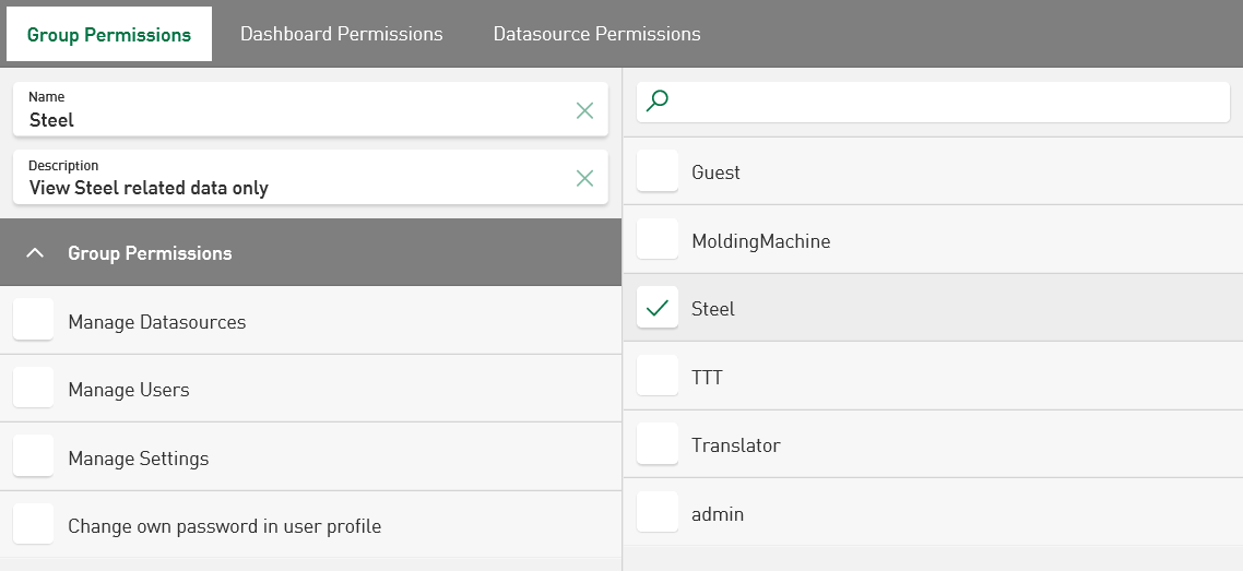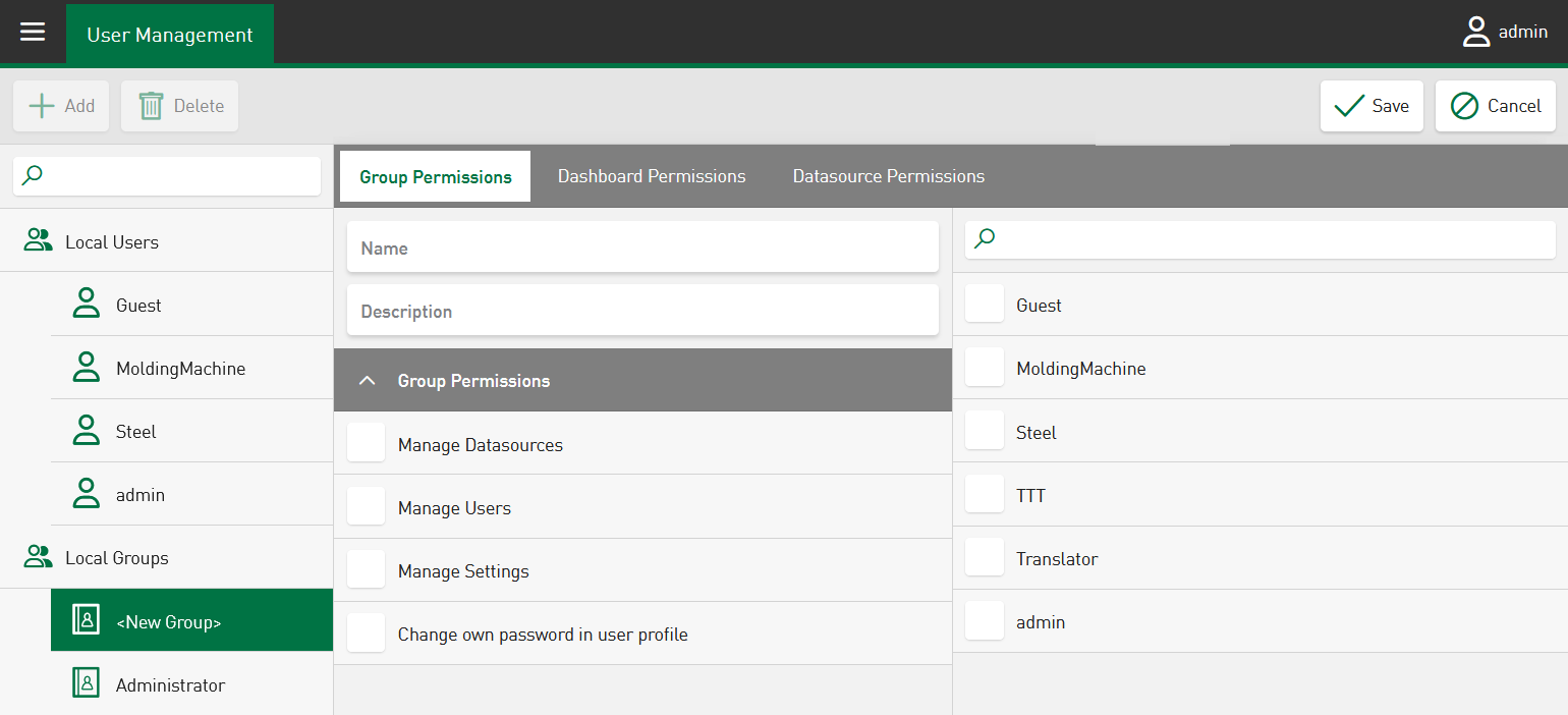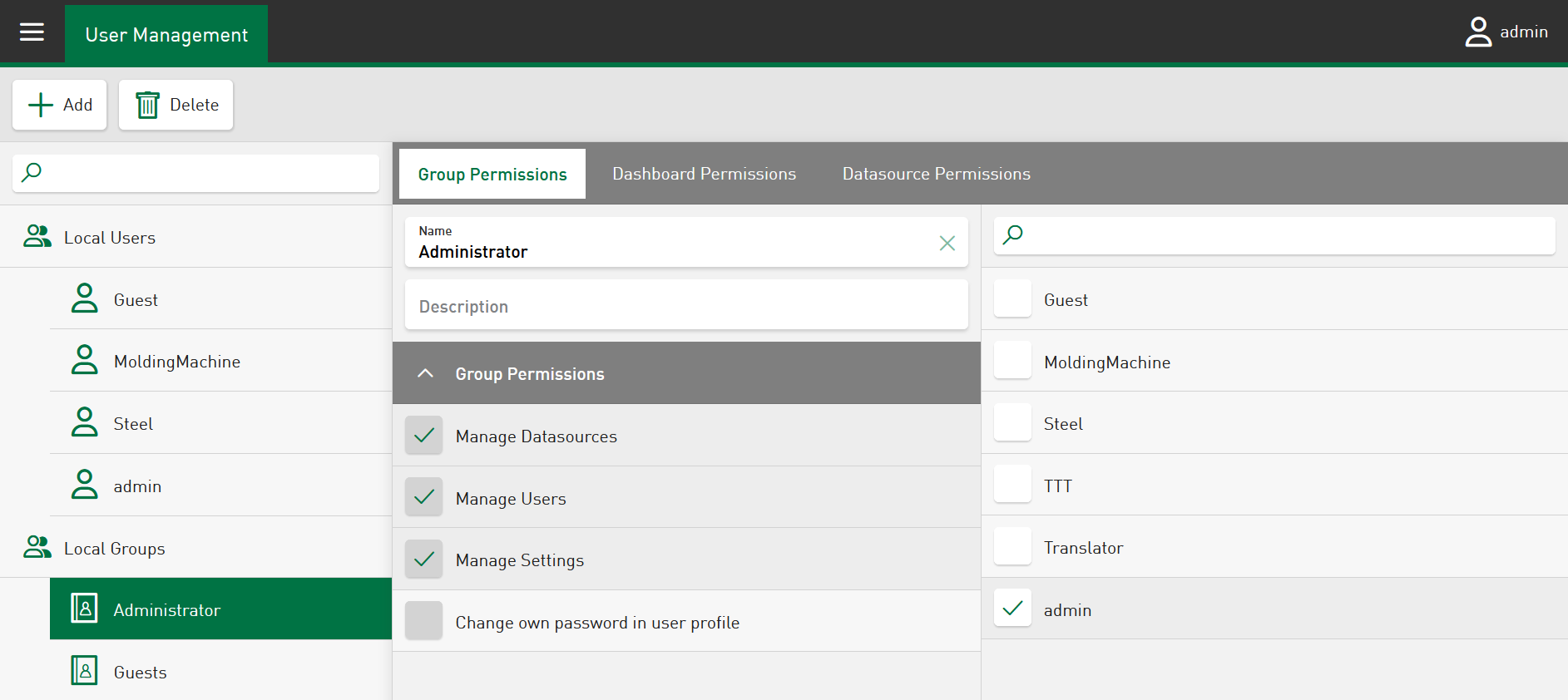 In addition to the users, groups can be created and assigned different permissions. A user can belong to several groups. With the initial installation, the "Administrator" group is available, which has all permissions. The right to change the password cannot be changed as the permission generally exists for the "Administrator" group.