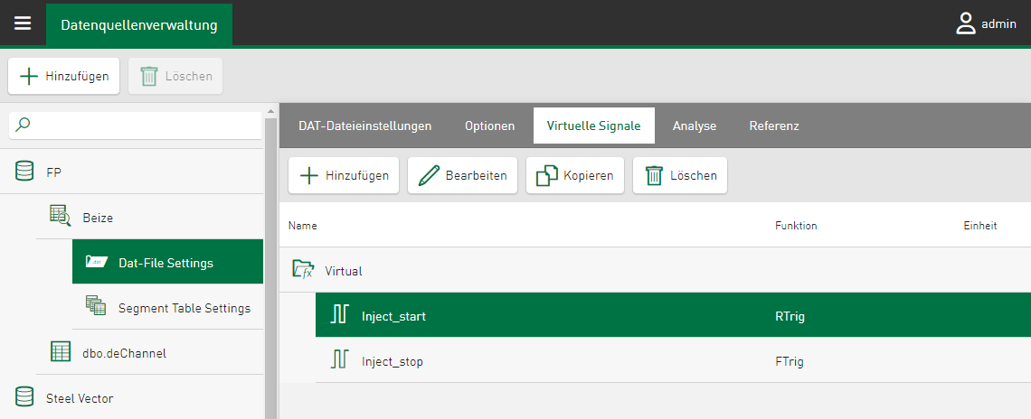 In der Datenquellenverwaltung können Sie virtuelle Signale aus unterschiedlichen Datenquellen hinzufügen und bearbeiten, um Vergleichswerte für Datenbanktabellen, DAT-Dateien und HD-Ablagen darzustellen. Bereits konfigurierte virtuelle Funktionen werden in tabellarischer Form angezeigt. Die aktuell ausgewählte und bearbeitete Funktion ist immer grün hinterlegt.