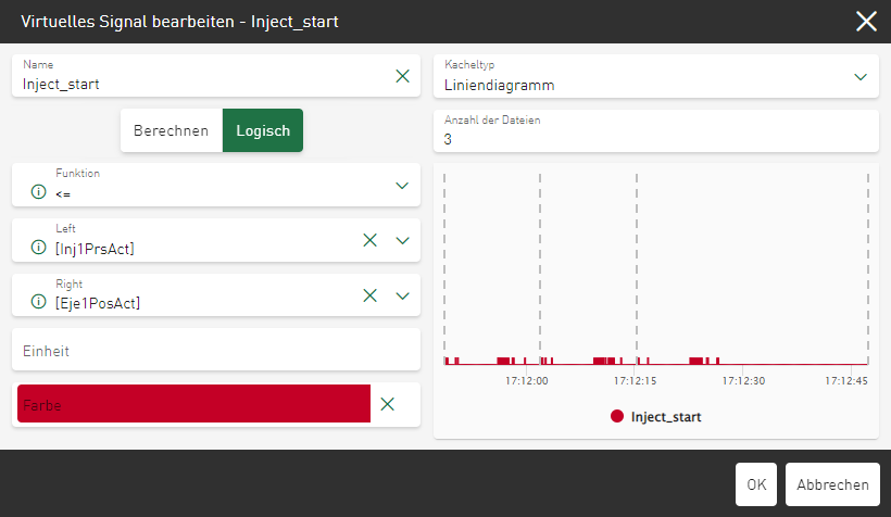 Im Vorschaubereich wird passend zur aktuellen Datenquelle und den gewählten Funktionen das aktuell ermittelte Ergebnis für das virtuelle Signal angezeigt. Als Standardansicht wird das virtuelle Signal in einem Liniendiagramm dargestellt.