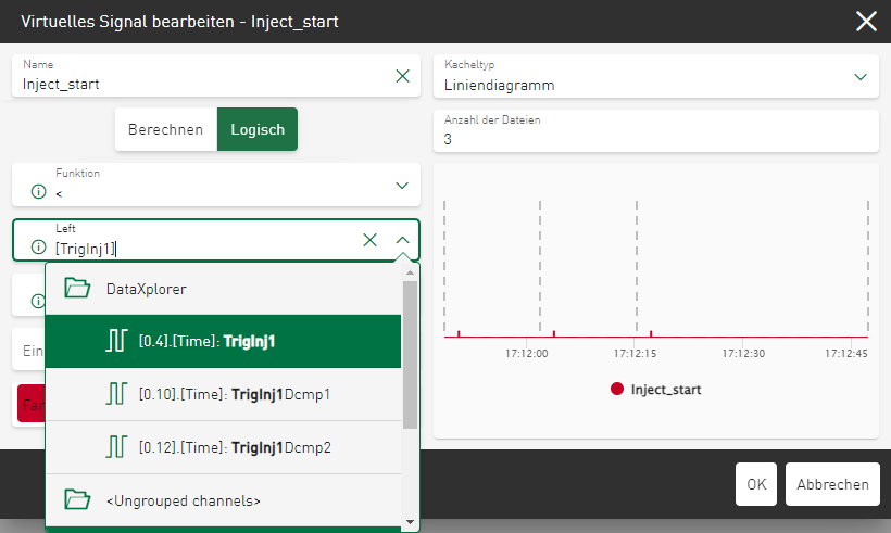 Die Anzahl der im Dialog eingeblendeten Eingangs- und Parametereingabefelder ändert sich entsprechend der gewählten Funktionsgruppe. In den jeweiligen Eingabefeldern können Sie über eine Auswahlliste den Signalbaum der hinterlegten Datenquelle aufrufen. Tippen Sie auf einen Namen im Signalbaum und wählen Sie gezielt einen Wert für das jeweilige Parameterfeld des virtuellen Signals aus. Je nach Auswahl können auch mehrere Werte angewählt werden.