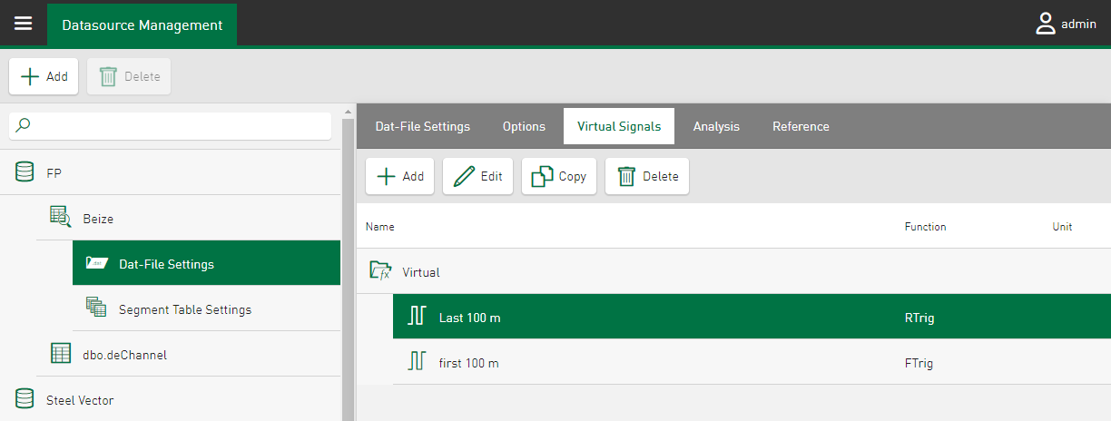 In the Datasource Management, you can add and edit virtual signals from different datasources to display comparison values for database tables, DAT files and HD stores. Virtual functions that have already been configured are displayed in tabular form. The currently selected and edited function is always highlighted in green.